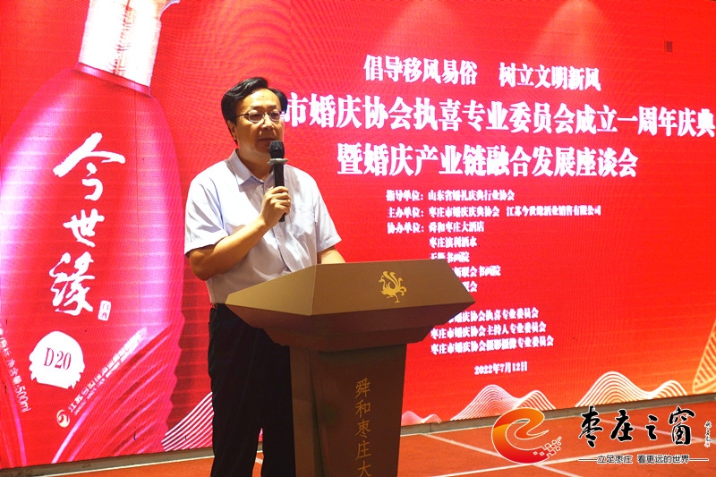為貫徹落實(shí)上級(jí)部門(mén)提出的倡導(dǎo)文明、喜事新辦,移風(fēng)易俗,減少陋習(xí),新事簡(jiǎn)辦的工作方針,建立健全婚禮執(zhí)喜的有序化,更好的構(gòu)建和諧社會(huì),為“工業(yè)強(qiáng)市、產(chǎn)業(yè)興市”做貢獻(xiàn)。7月12日下午,由棗莊市婚慶慶典協(xié)會(huì)、江蘇今世緣酒業(yè)銷(xiāo)售有限公司主辦的棗莊市婚慶慶典協(xié)會(huì)執(zhí)喜專(zhuān)業(yè)委員會(huì)成立一周年慶典暨婚慶產(chǎn)業(yè)鏈融合發(fā)展座談會(huì)在舜和棗莊大酒店舉辦,執(zhí)喜專(zhuān)委會(huì)成員、專(zhuān)委會(huì)顧問(wèn)團(tuán)成員、棗莊婚慶界、餐飲界、商業(yè)界代表60余人參加活動(dòng)。